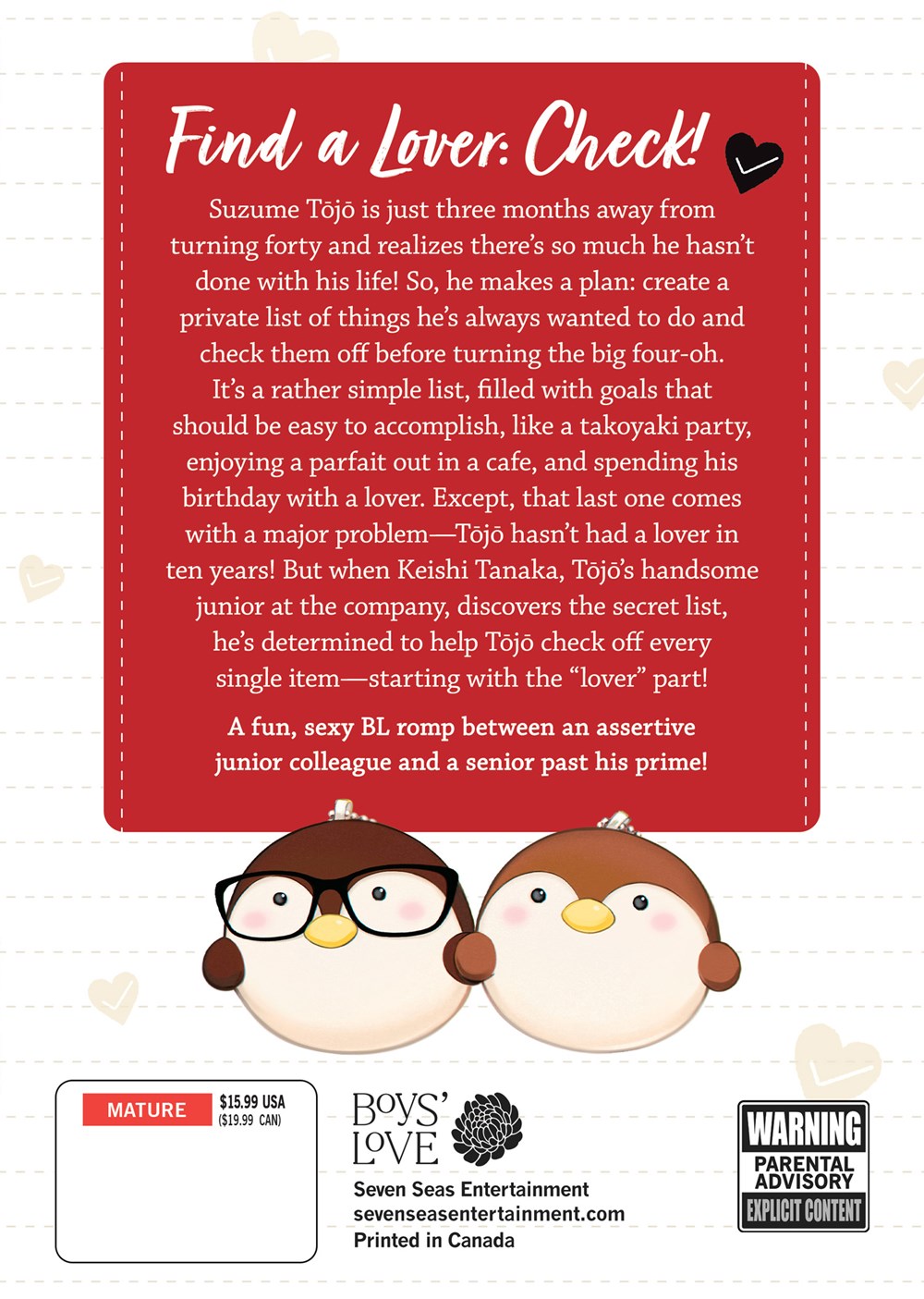 Suzume Tōjō is just three months away from turning forty and realizes there's so much he hasn't done with his life! So, he makes a plan: create a private list of things he's always wanted to do and check them off before turning the big four-oh. It's a rather simple list, filled with goals that should be easy to accomplish, like a takoyaki party, enjoying a parfait out in a cafe, and spending his birthday with a lover. Except, that last one comes with a major problem—Tōjō hasn't had a lover in ten years! But when Keishi Tanaka, Tōjō's handsome junior at the company, discovers the secret list, he's determined to help Tōjō check off every single item—starting with the “lover” part!