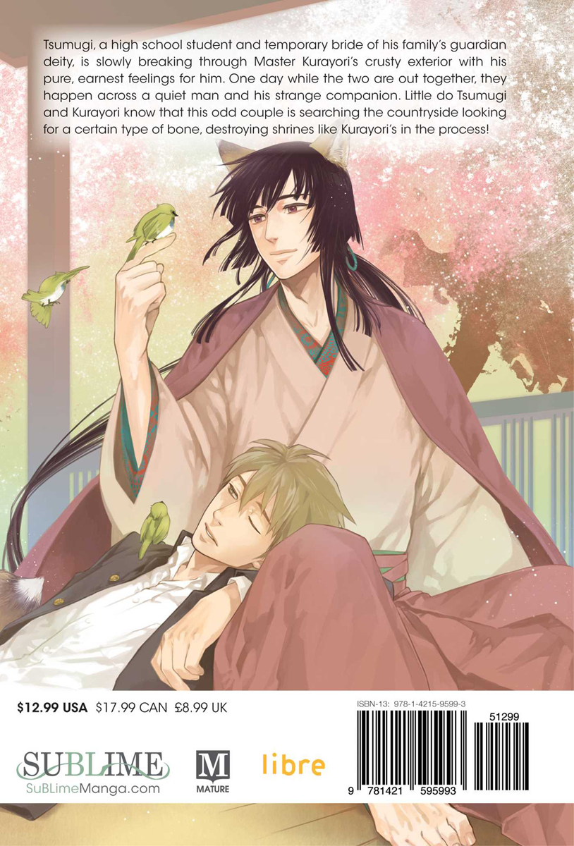 Tsumugi, a high school student and temporary bride of his family’s guardian deity, is slowly breaking through Master Kurayori’s crusty exterior with his pure, earnest feelings for him. One day while the two are out together, they happen across a quiet man and his strange companion. Little do Tsumugi and Kurayori know that this odd couple is searching the countryside looking for a certain type of bone, destroying shrines like Kurayori’s in the process!