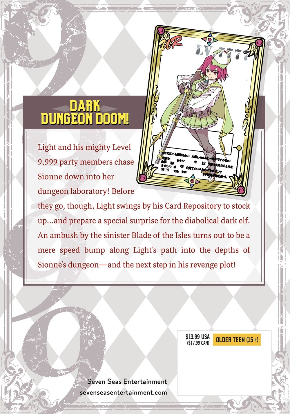 Light and his mighty Level 9,999 party members chase Sionne down into her dungeon laboratory! Before they go, though, Light swings by his Card Repository to stock up…and prepare a special surprise for the diabolical dark elf. An ambush by the sinister Blade of the Isles turns out to be a mere speed bump along Light's path into the depths of Sionne's dungeon—and the next step in his revenge plot!