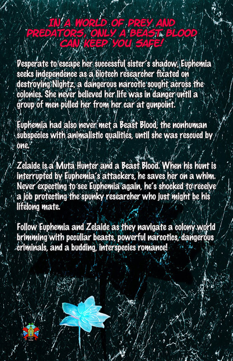 Desperate to escape her successful sister’s shadow, Euphemia seeks independence as a biotech researcher fixated on destroying Nightz, a dangerous narcotic sought across the colonies. She never believed her life was in danger until a group of men pulled her from her car at gunpoint. Euphemia had also never met a Beast Blood, the nonhuman subspecies with animalistic qualities, until she was rescued by one.