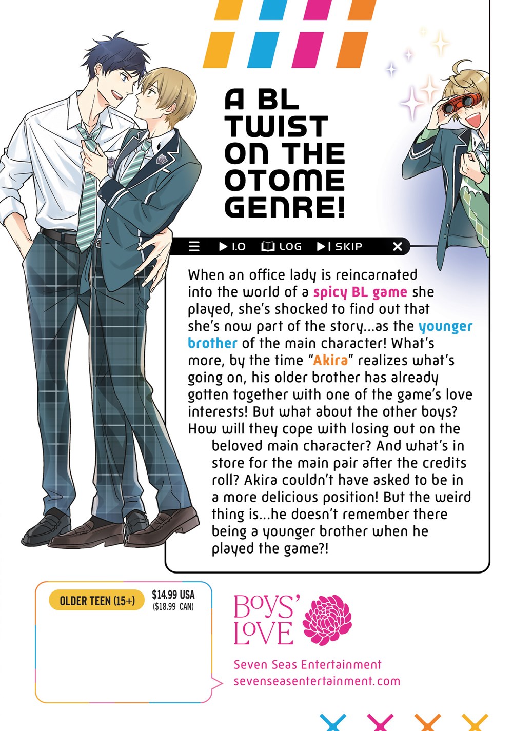 When an office lady is reincarnated into the world of a spicy BL game she played, she's shocked to find out that she's now part of the story…as the younger brother of the main character! What's more, by the time “Akira” realizes what's going on, his older brother has already gotten together with one of the game's love interests! But what about the other boys? How will they cope with losing out on the beloved main character? And what's in store for the main pair after the credits roll? Akira couldn't have asked to be in a more delicious position! But the weird thing is…he doesn't remember there being a younger brother when he played the game?!