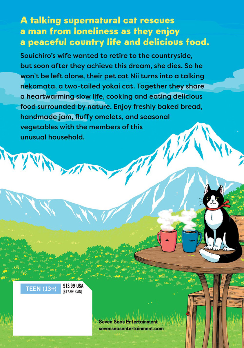 Souichiro’s wife wanted to retire to the countryside, but soon after they achieve this dream, she dies. So he won’t be left alone, their pet cat Nii turns into a talking nekomata, a two-tailed yokai cat. Together they share a heartwarming slow life, cooking and eating delicious food surrounded by nature. Enjoy freshly baked bread, handmade jam, fluffy omelets, and seasonal vegetables with the members of this unusual household.