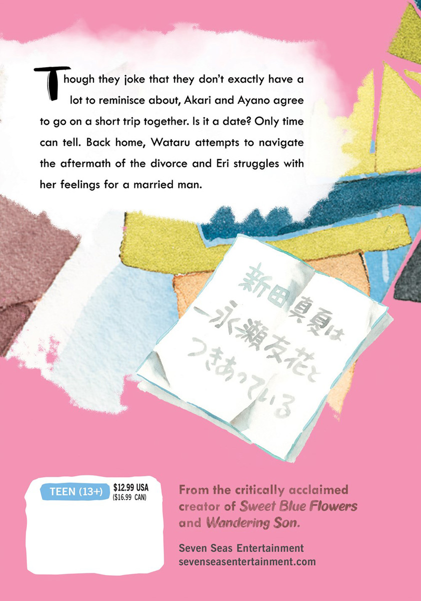 Though they joke that they don’t exactly have a lot to reminisce about, Akari and Ayano agree to go on a short trip together. Is it a date? Only time can tell. Back home, Wataru attempts to navigate the aftermath of the divorce and Eri struggles with her feelings for a married man.