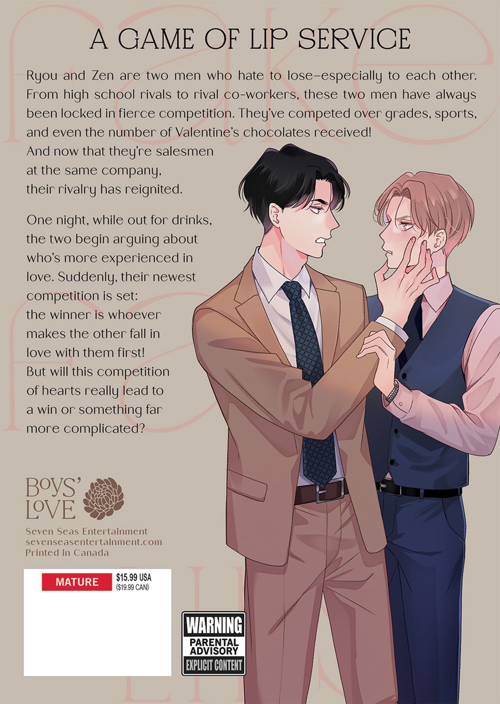 Ryou and Zen are two men who hate to lose–especially to each other. From high school rivals to rival co-workers, these two men have always been locked in fierce competition. They've competed over grades, sports, and even the number of Valentine's chocolates received! And now that they're salesmen at the same company, their rivalry has reignited.
