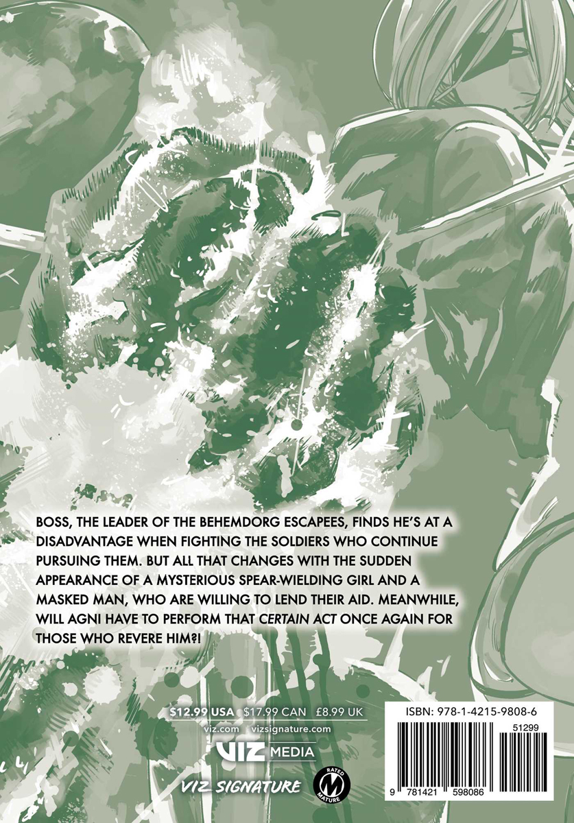 Boss, the leader of the Behemdorg escapees, finds he’s at a disadvantage when fighting the soldiers who continue pursuing them. But all that changes with the sudden appearance of a mysterious spear-wielding girl and a masked man who are willing to lend their aid. Meanwhile, will Agni have to perform that certain act once again for those who revere him?!