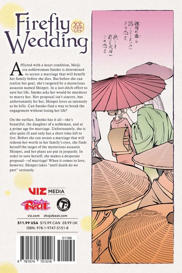 On the surface, Satoko has it all - she's beautiful, the daughter of a nobleman, and at a prime age for marriage. Unfortunately, she is also quite ill and only has a short time left to live. Before she can secure a marriage that will redeem her worth in her family's eyes, she finds herself the target of the mysterious assassin Shinpei, and her plans are put in jeopardy. In order to save herself, she makes a desperate proposal - of marriage! When it comes to love, however, Shinpei takes “until death do we part” seriously.