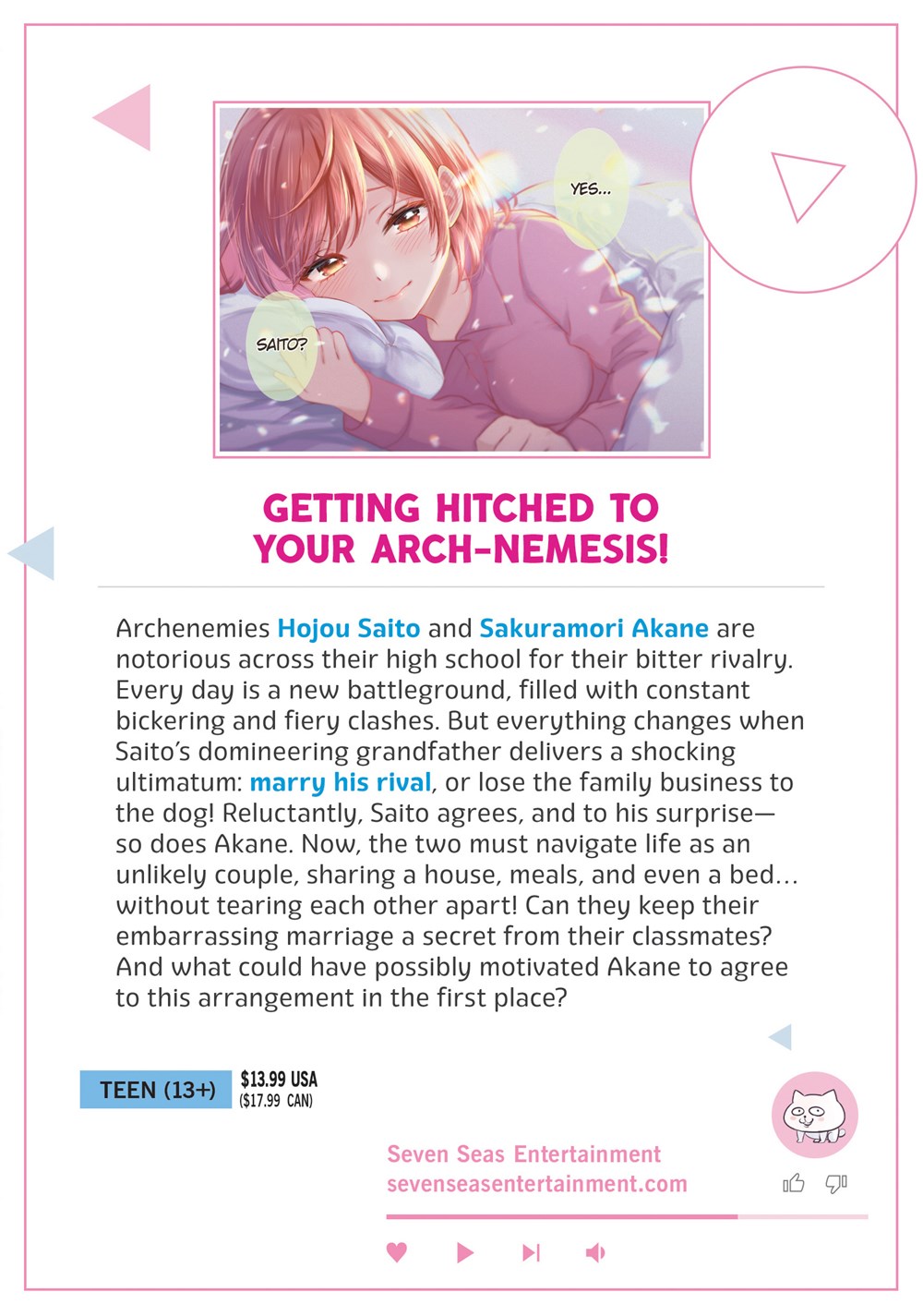 Archenemies Hojou Saito and Sakuramori Akane are notorious across their high school for their bitter rivalry. Every day is a new battleground, filled with constant bickering and fiery clashes. But everything changes when Saito's domineering grandfather delivers a shocking ultimatum: marry his rival, or lose the family business to the dog! Reluctantly, Saito agrees, and to his surprise—so does Akane. Now, the two must navigate life as an unlikely couple, sharing a house, meals, and even a bed…without tearing each other apart! Can they keep their embarrassing marriage a secret from their classmates? And what could have possibly motivated Akane to agree to this arrangement in the first place?