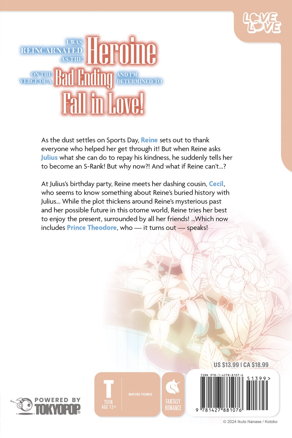 At Julius's birthday party, Reine meets her dashing cousin, Cecil, who seems to know something about Reine's buried history with Julius… While the plot thickens around Reine's mysterious past and her possible future in this otome world, Reine tries her best to enjoy the present, surrounded by all her friends! …Which now includes Prince Theodore, who — it turns out — speaks!