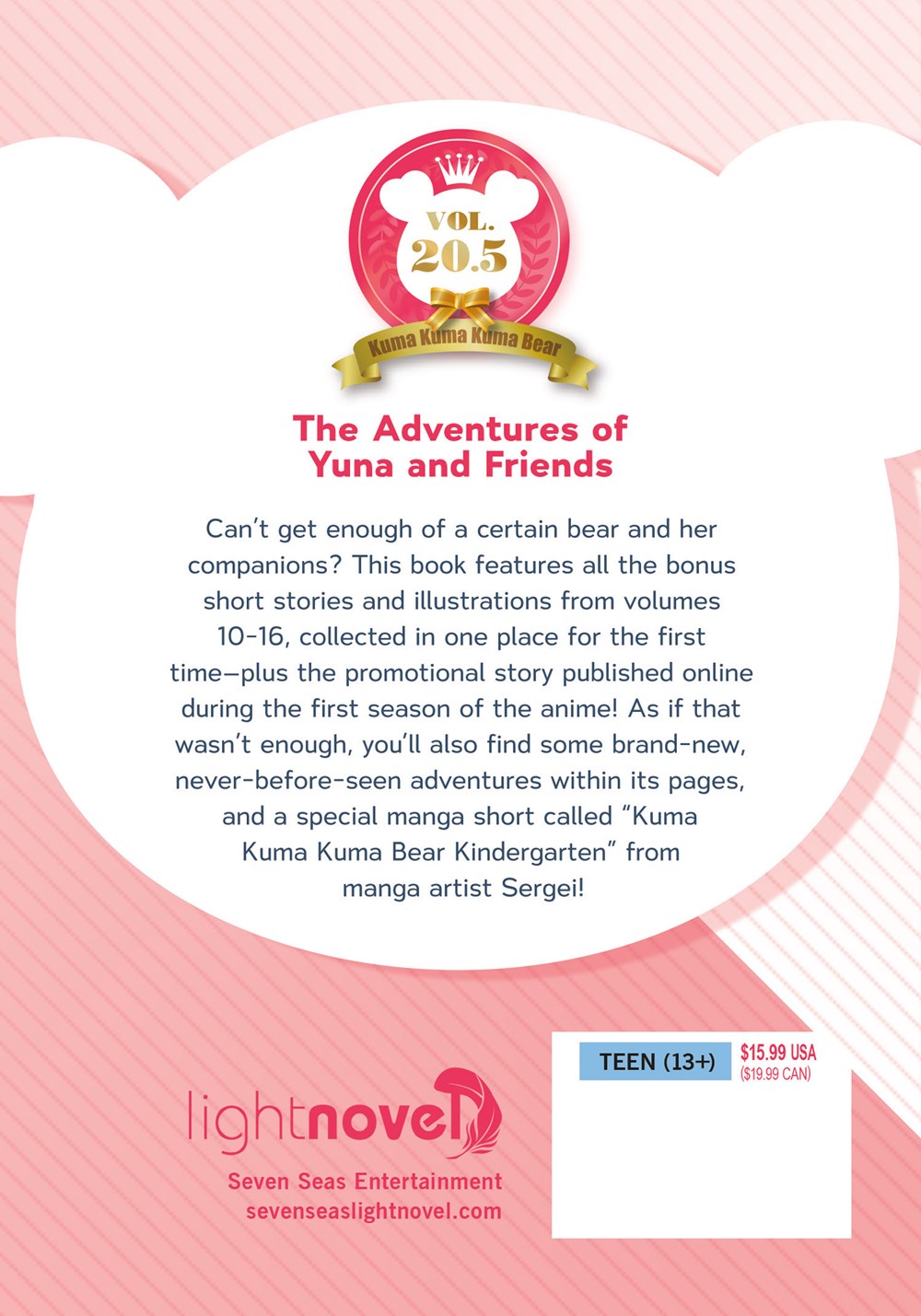 Can't get enough of a certain bear and her companions? This book features all the bonus short stories and illustrations from volumes 10-16, collected in one place for the first time—plus the promotional story published online during the first season of the anime! As if that wasn't enough, you'll also find some brand-new, never-before-seen adventures within its pages, and a special manga short called “Kuma Kuma Kuma Bear Kindergarten” from manga artist Sergei!