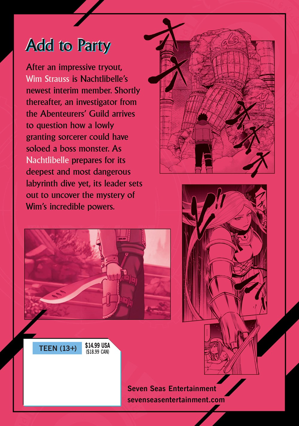 After an impressive tryout, Wim Strauss is Nachtlibelle's newest interim member. Shortly thereafter, an investigator from the Abenteurers' Guild arrives to question how a lowly granting sorcerer could have soloed a boss monster. As Nachtlibelle prepares for its deepest and most dangerous labyrinth dive yet, its leader sets out to uncover the mystery of Wim's incredible powers.