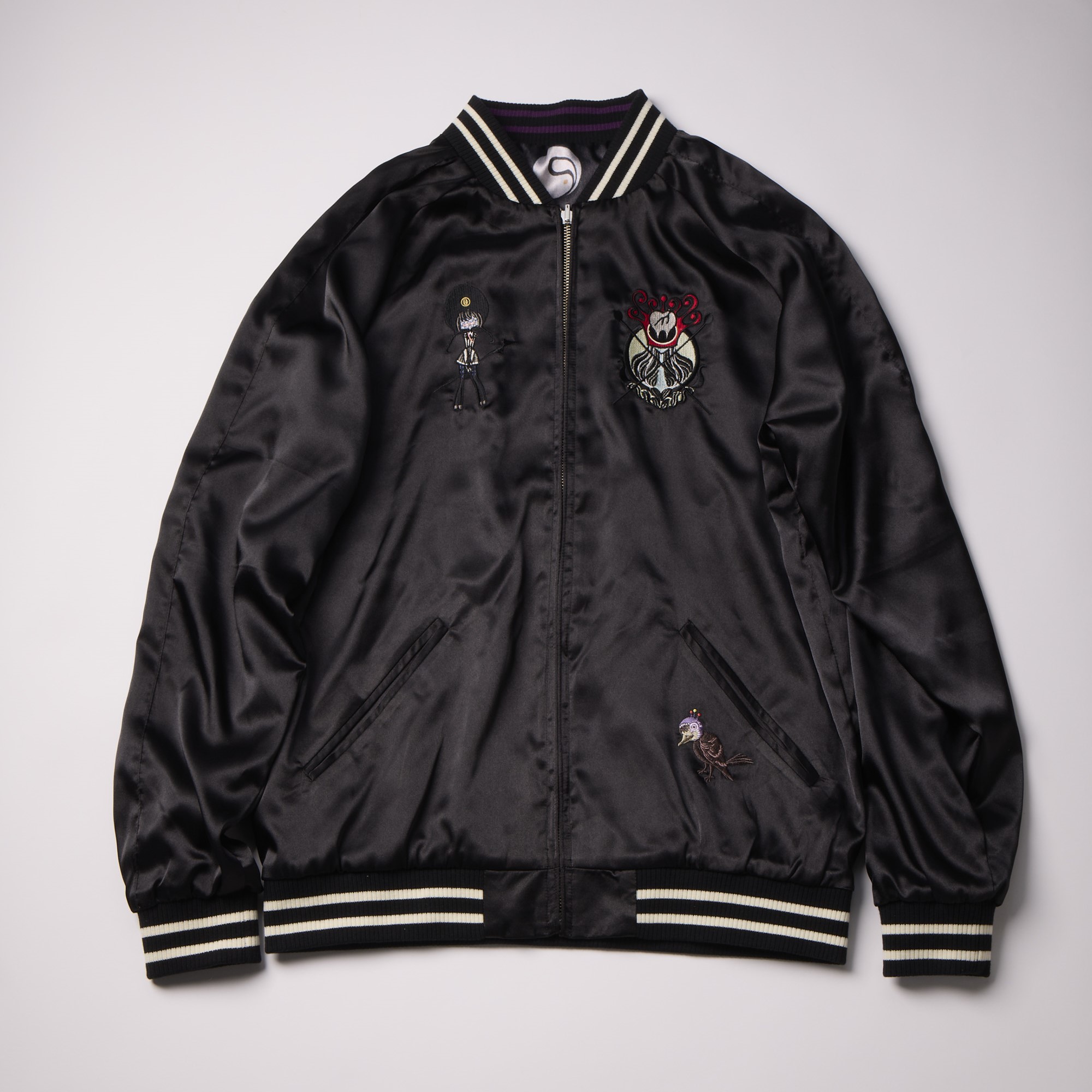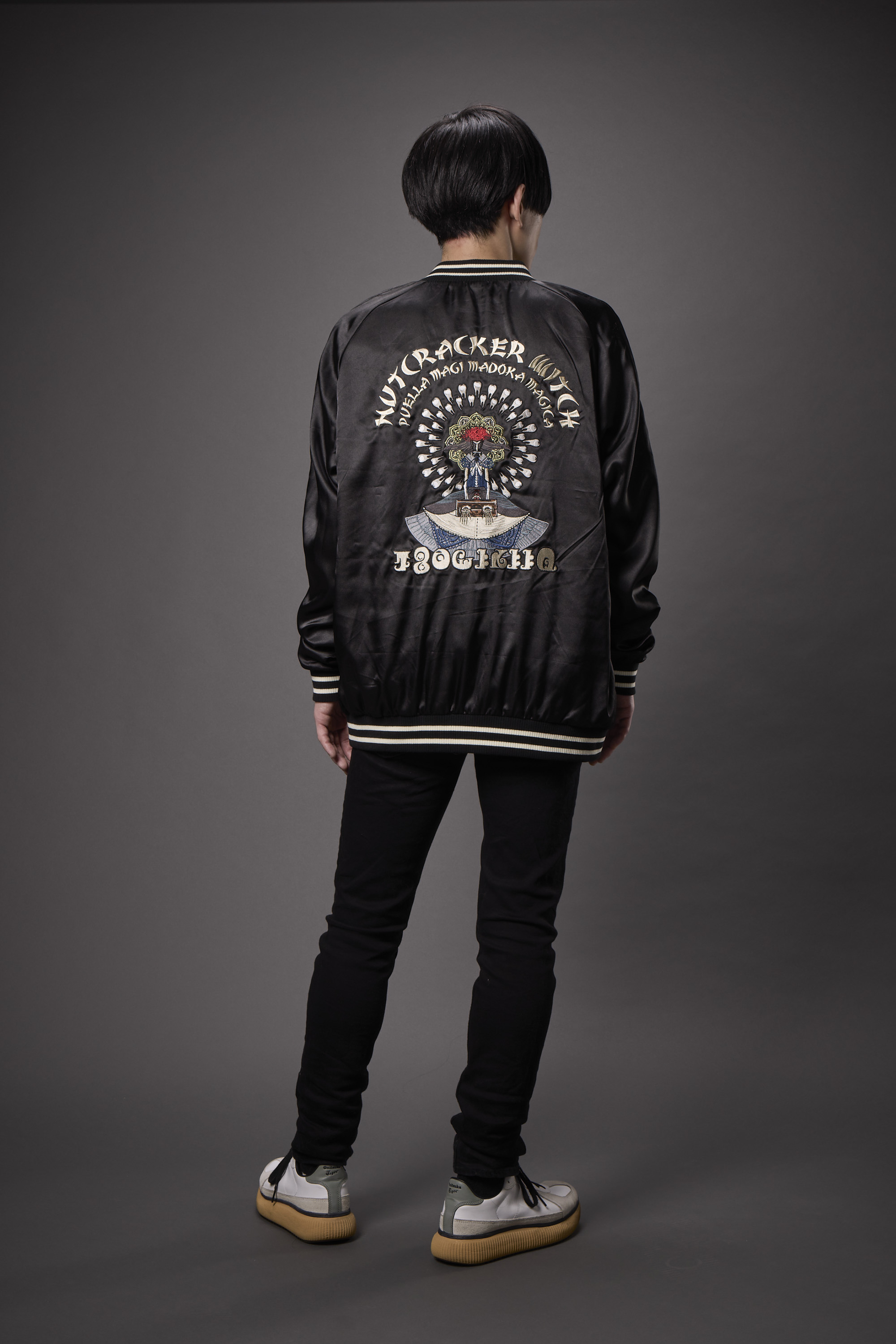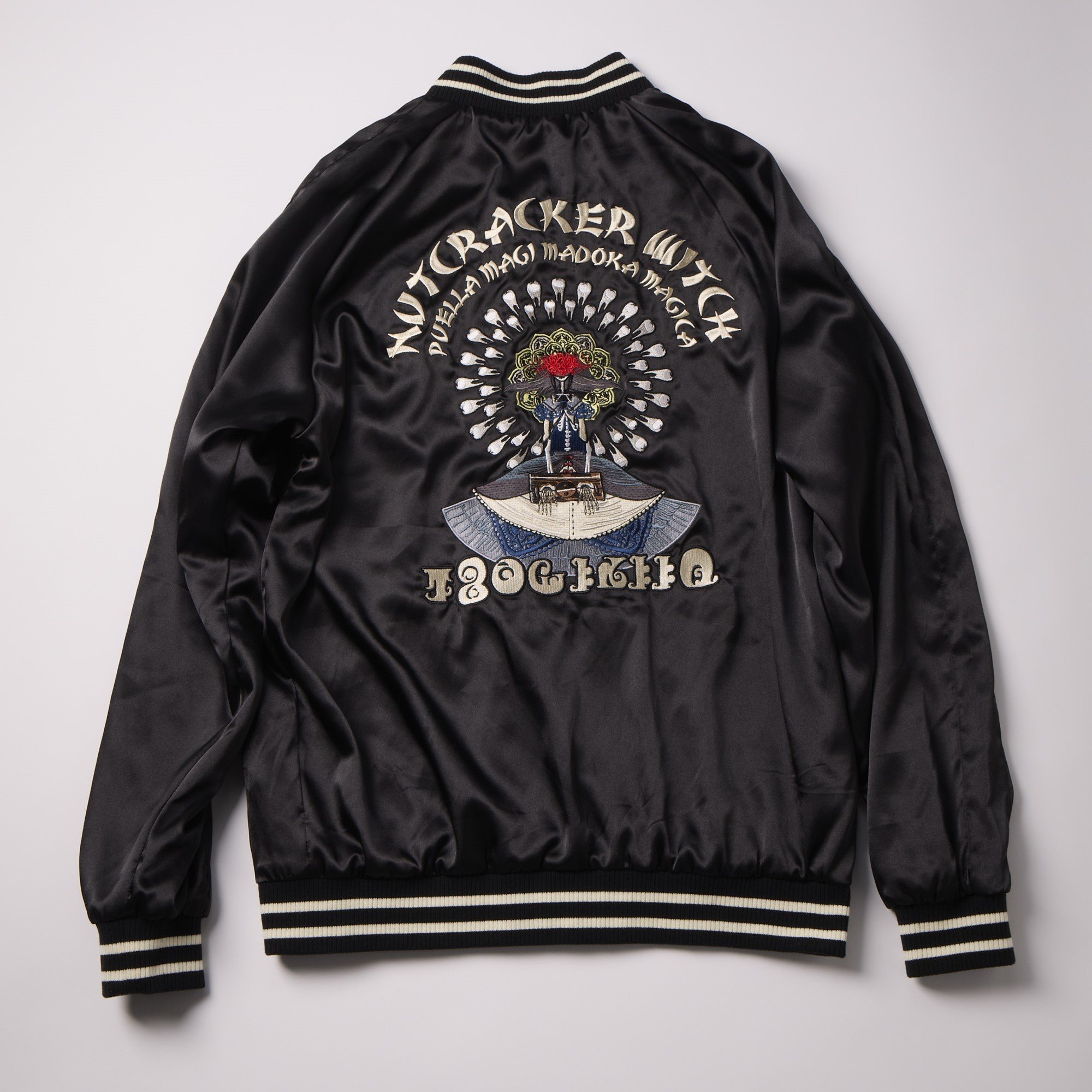 Being a magical girl… or witch isn’t all fun and games, but you can’t deny the fashion. Capture the duality of Homura’s transformation into Homulilly from “Puella Magi Madoka Magica the Movie -Rebellion-” with this striking reversible sukajan jacket (also known as a souvenir jacket). One side features the haunting Nutcracker Witch, while the other showcases technicolor witchy imagery. Show off your love for the darker side of the magical girl saga with this unique jacket.