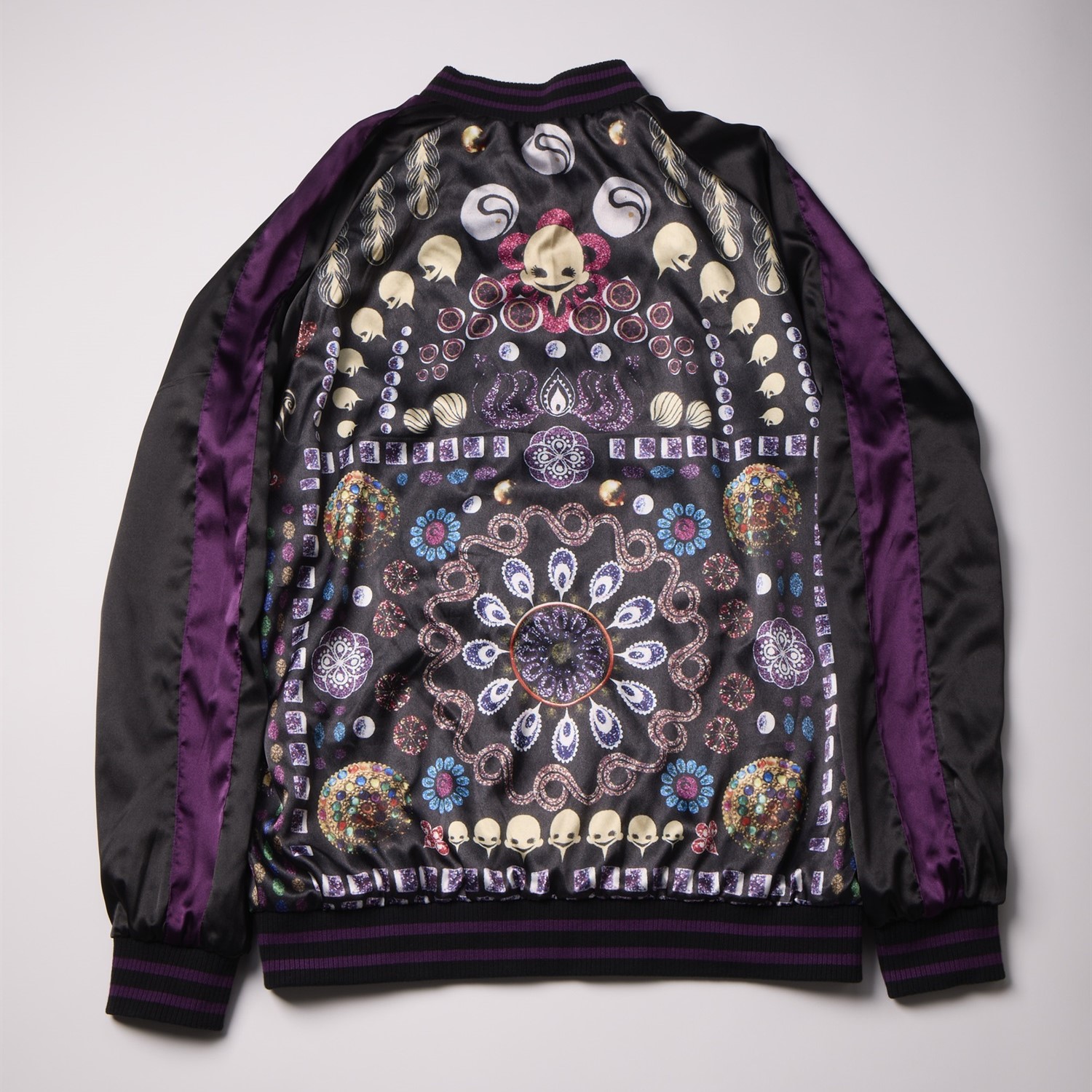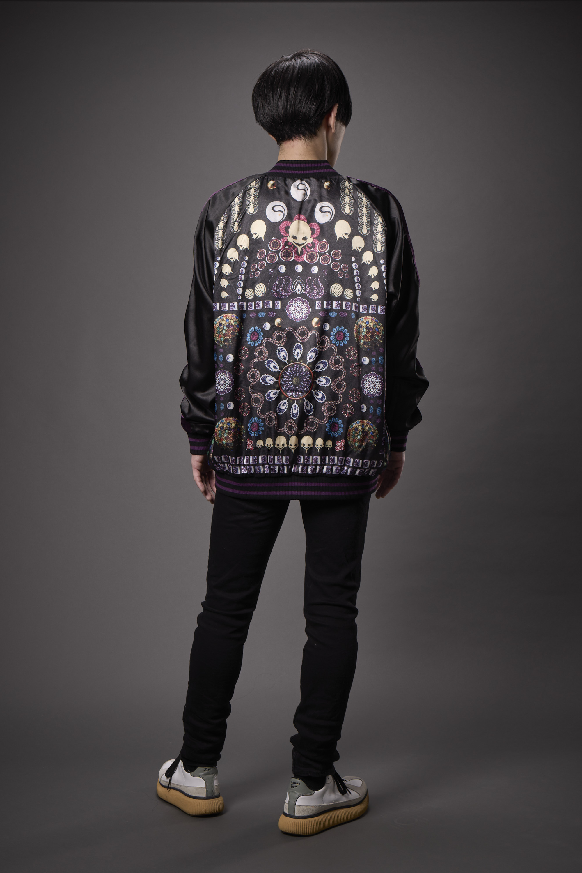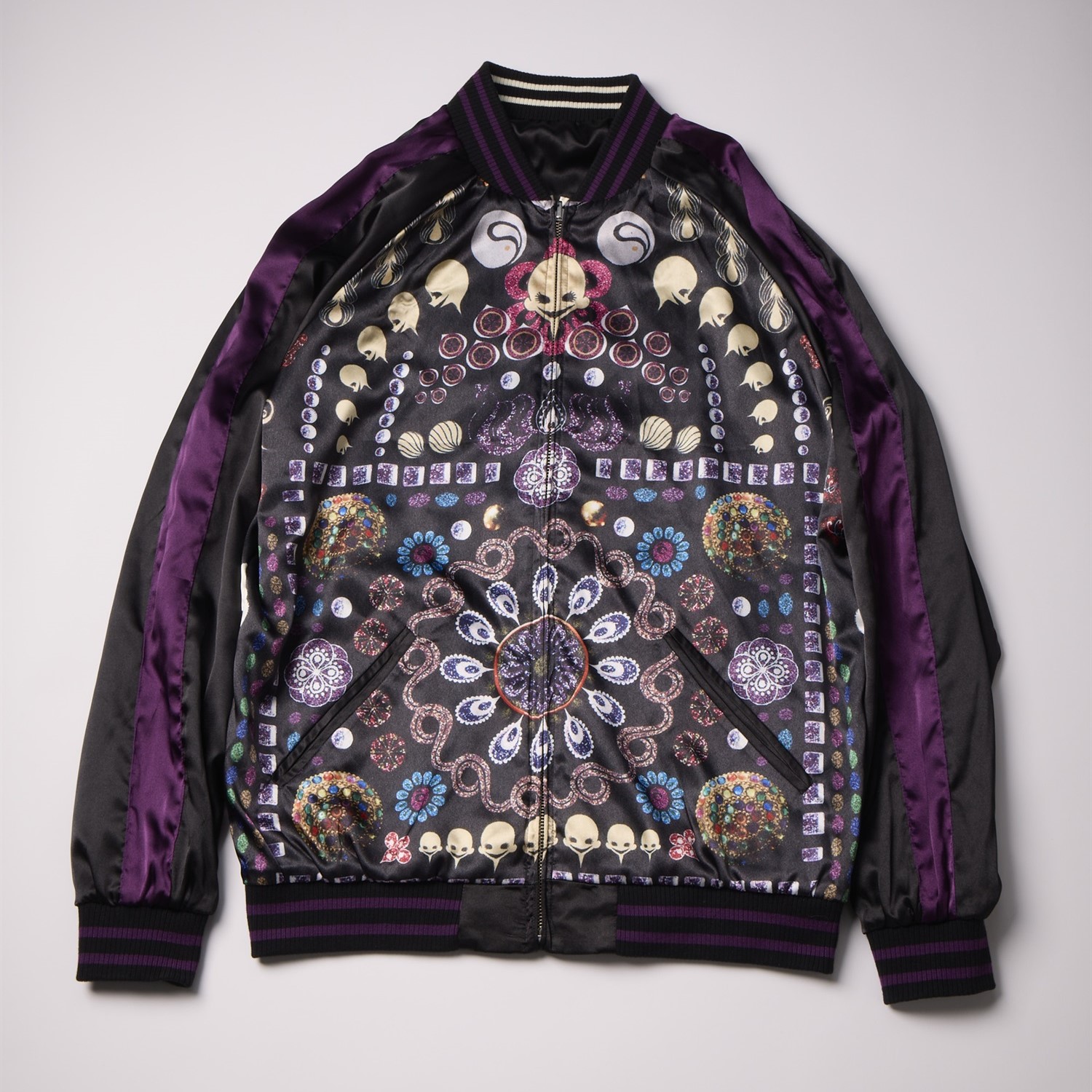 Being a magical girl… or witch isn’t all fun and games, but you can’t deny the fashion. Capture the duality of Homura’s transformation into Homulilly from “Puella Magi Madoka Magica the Movie -Rebellion-” with this striking reversible sukajan jacket (also known as a souvenir jacket). One side features the haunting Nutcracker Witch, while the other showcases technicolor witchy imagery. Show off your love for the darker side of the magical girl saga with this unique jacket.
