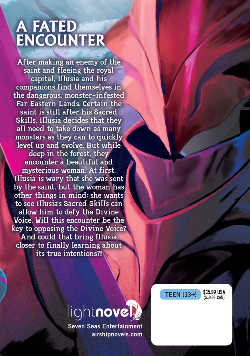 After making an enemy of the saint and fleeing the royal capital, Illusia and his companions find themselves in the dangerous, monster-infested Far Eastern Lands. Certain the saint is still after his Sacred Skills, Illusia decides that they all need to take down as many monsters as they can to quickly level up and evolve. But while deep in the forest, they encounter a beautiful and mysterious woman. At first, Illusia is wary that she was sent by the saint, but the woman has other things in mind: she wants to see Illusia's Sacred Skills can allow him to defy the Divine Voice. Will this encounter be the key to opposing the Divine Voice? And could that bring Illusia closer to finally learning about its true intentions?!
