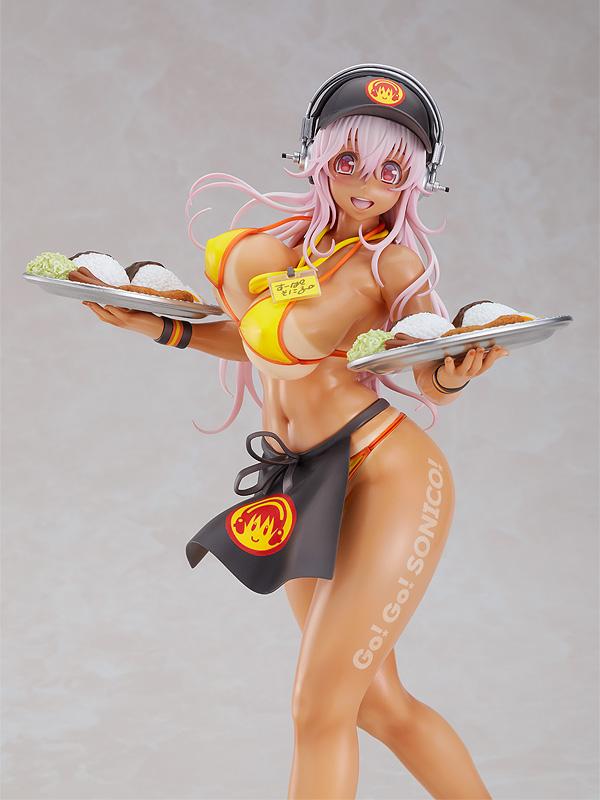 Presenting a scale figure of Super Sonico in a sexy bikini waitress outfit! The 1/6th scale figure is based on an original illustration by Tsuji Santa. Sonico has been recreated carrying giant plates of curry in both hands. The figure features plenty of dynamic sculpt work and carefully painted tan lines, making for a figure with plenty of detail from head to toe. Be sure to add her to your collection!
