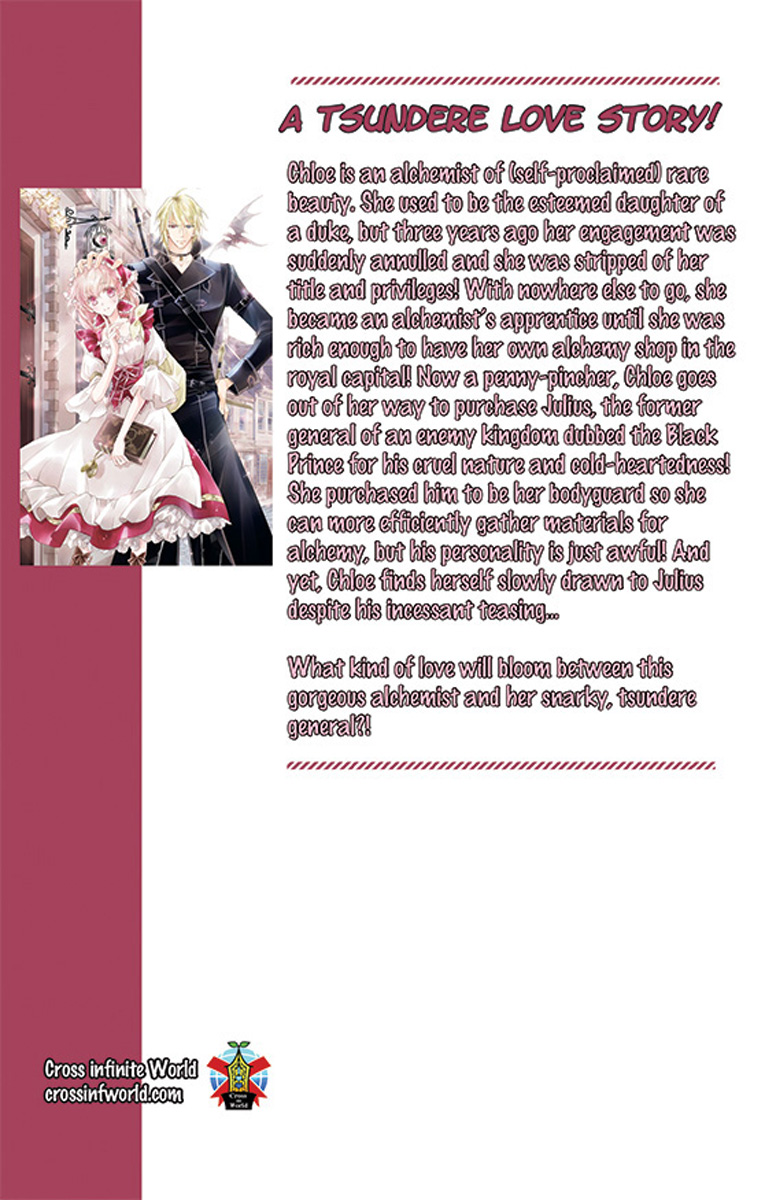Chloe is an alchemist of (self-proclaimed) rare beauty. She used to be the esteemed daughter of a duke, but three years ago her engagement was suddenly annulled and she was stripped of her title and privileges! With nowhere else to go, she became an alchemist's apprentice until she was rich enough to have her own alchemy shop in the royal capital! Now a penny-pincher, Chloe goes out of her way to purchase Julius, the former general of an enemy kingdom dubbed the Black Prince for his cruel nature and cold-heartedness! She purchased him to be her bodyguard so she can more efficiently gather materials for alchemy, but his personality is just awful! And yet, Chloe finds herself slowly drawn to Julius despite his incessant teasing...