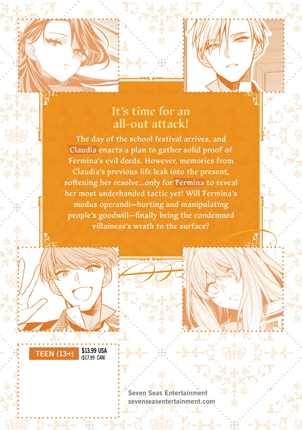 The day of the school festival arrives, and Claudia enacts a plan to gather solid proof of Fermina's evil deeds. However, memories from Claudia's previous life leak into the present, softening her resolve…only for Fermina to reveal her most underhanded tactic yet! Will Fermina's modus operandi—hurting and manipulating people's goodwill—finally bring the condemned villainess's wrath to the surface?