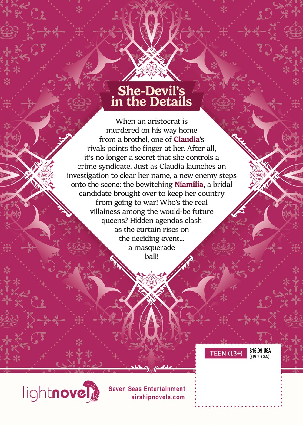 When an aristocrat is murdered on his way home from a brothel, one of Claudia's rivals points the finger at her. After all, it's no longer a secret that she controls a crime syndicate. Just as Claudia launches an investigation to clear her name, a new enemy steps onto the scene: the bewitching Niamilia, a bridal candidate brought over to keep her country from going to war! Who's the real villainess among the would-be future queens? Hidden agendas clash as the curtain rises on the deciding event… a masquerade ball!