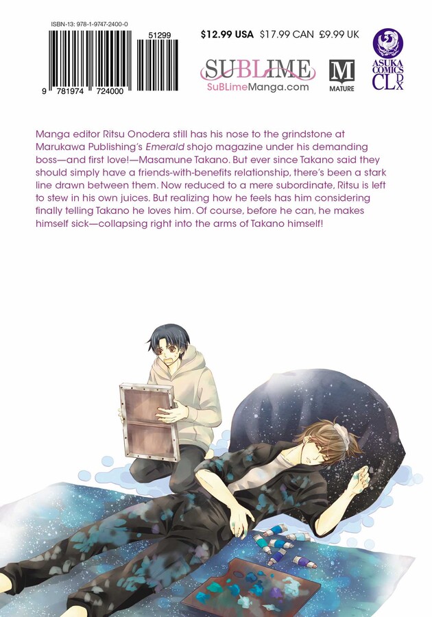 Manga editor Ritsu Onodera still has his nose to the grindstone at Marukawa Publishing’s Emerald shojo magazine under his demanding boss - and first love! - Masamune Takano. But ever since Takano said they should simply have a friends-with-benefits relationship, there’s been a stark line drawn between them. Now reduced to a mere subordinate, Ritsu is left to stew in his own juices. But realizing how he feels has him considering finally telling Takano he loves him. Of course, before he can, he makes himself sick - collapsing right into the arms of Takano himself!
