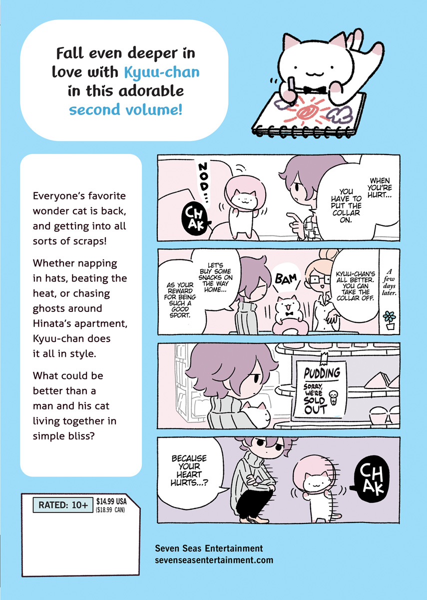 Everyone’s favorite wonder cat is back, and getting into all sorts of scraps! Whether napping in hats, beating the heat, or chasing ghosts around Hinata’s apartment, Kyuu-chan does it all in style. What could be better than a man and his cat living together in simple bliss?