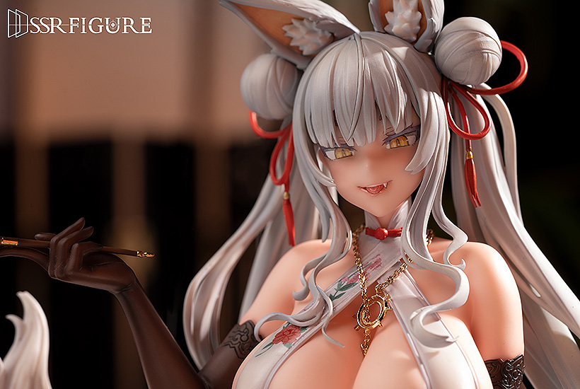 Asanagi's original illustration has been faithfully captured in figure form, with careful sculpting of her voluptuous body, a charming expression that conveys both her gorgeous looks and cunning and dynamically modeled hair. Don't miss the exceptional textural detail of her tail, either. The accessories adorning her body have also been carefully captured in figure form, and her realistic-looking shawl provides the figure a luxurious look.