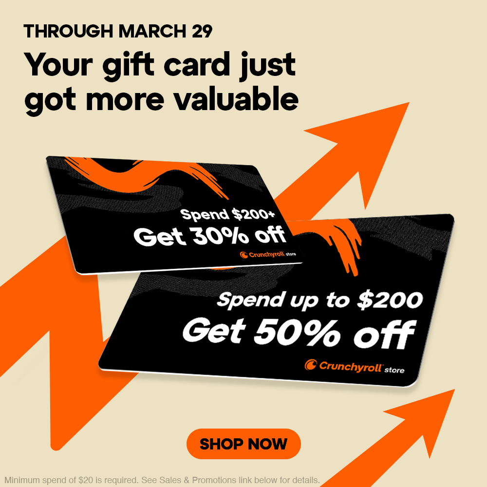 Discounts vary across categories and are only applicable to certain products for a limited time while supplies last. Promo codes not applicable. Items marked “final sale” not eligible for returns/exchanges. Not valid on prior purchases. For a limited time, Premium members can take advantage of the following benefits on the Crunchyroll Store: Fan: 5% discount on all products; Mega Fan: 10% discount on all products, free shipping within the continental U.S. on orders over $50; Ultimate Fan: 15% discount on all products, free shipping within the continental U.S. on all orders. Premium Member benefits will have the following exclusions: all items on sale, all Aniplex items, all Members Only items, membership cards, and gift cards.